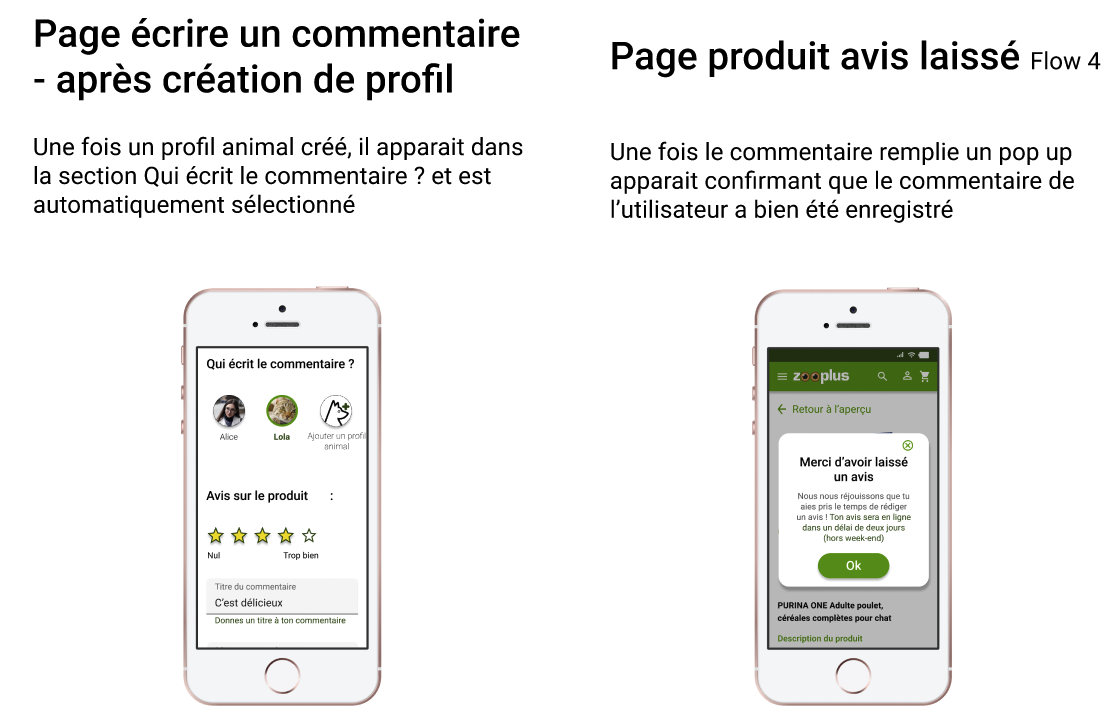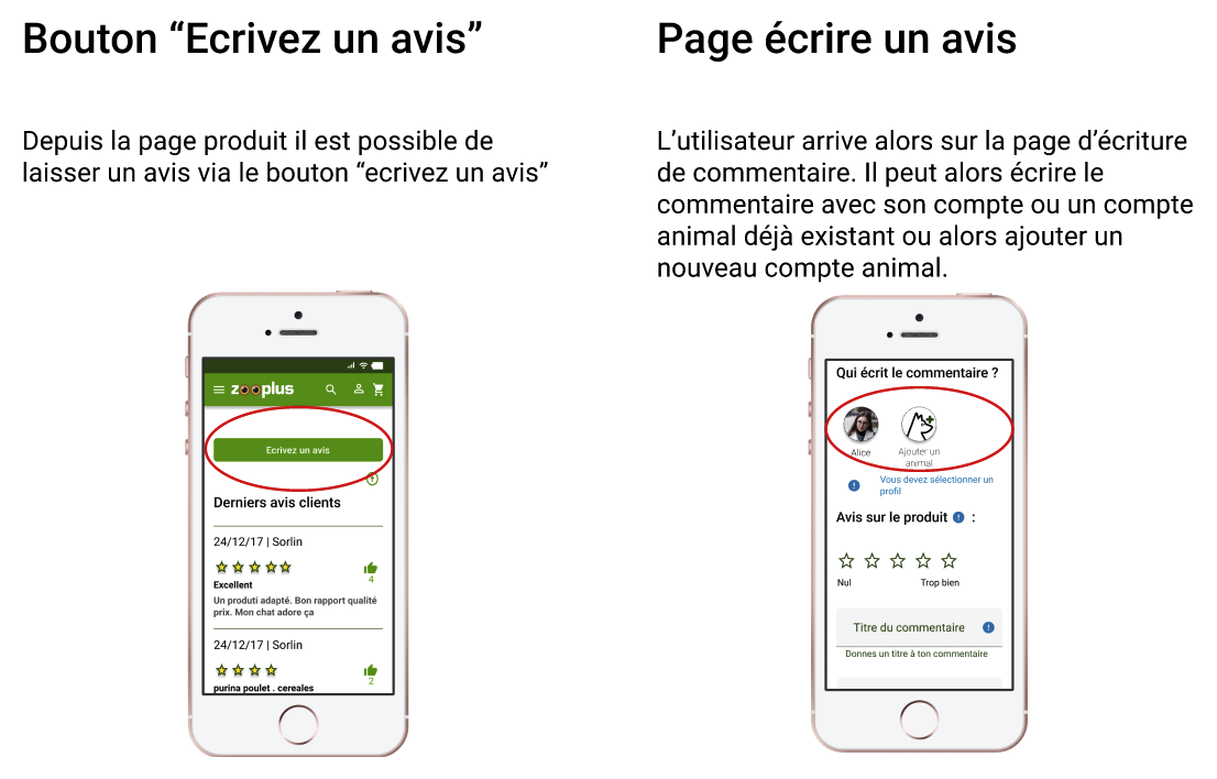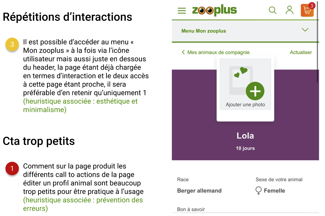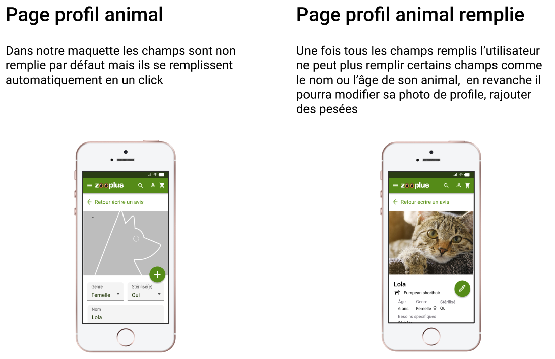 MĂȘme si certaines de nos fonctionnalitĂ©s rĂ©pondent Ă un rĂ©el besoin et sont plutĂŽt facilement utilisables dans lâensemble, elles manquent encore de maturitĂ© sur leur dĂ©finition et leur mise en place en terme dâinterface pour envisager dâĂȘtre dĂ©veloppĂ©es prochainement. Certaines comme la fonctionnalitĂ© âĂ©crire un avis au nom de mon animalâ nĂ©cessiterait aussi davantage de recueil de besoins dâutilisateurs pour envisager un dĂ©veloppement futur, en effet, dans lâĂ©tat cette fonctionnalitĂ© semble utile uniquement Ă une faible proportion dâutilisateurs.